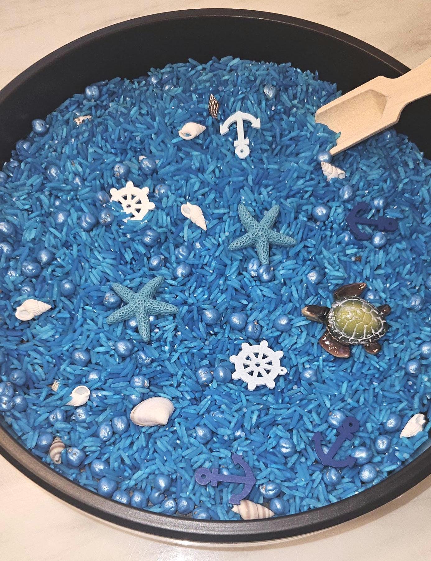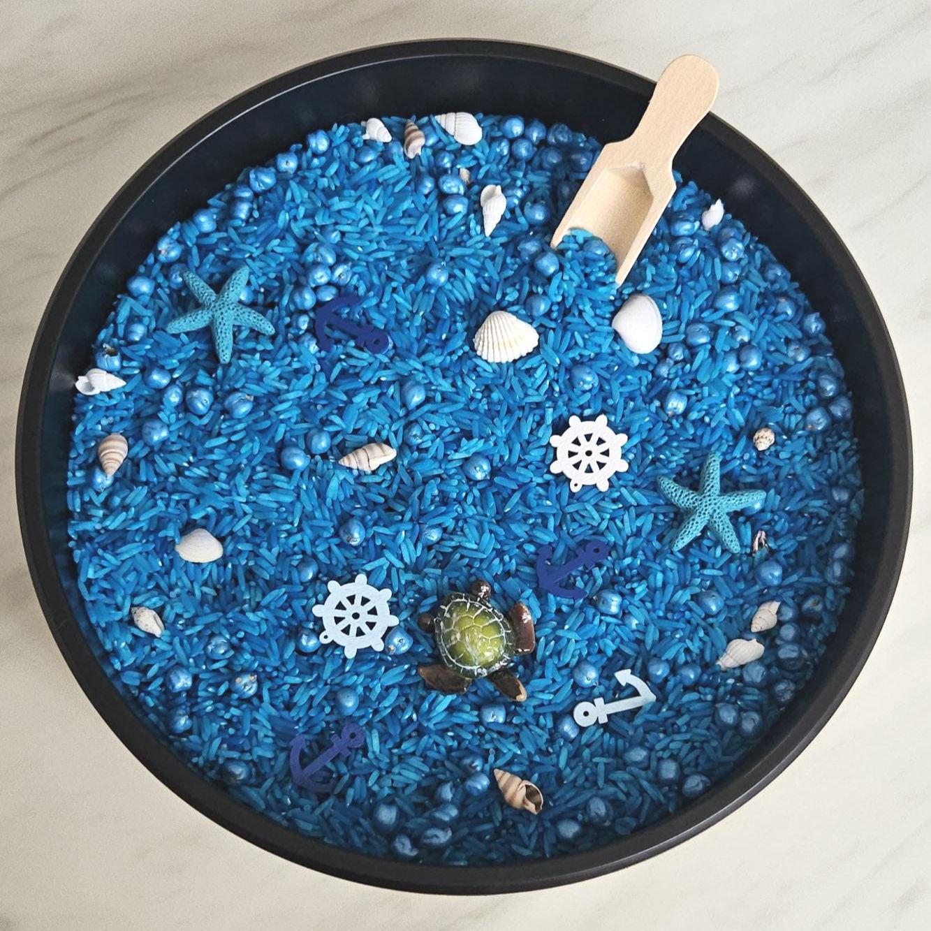 Children can create underwater worlds, rescue sea creatures, build colourful coral reefs and invent endless ocean adventures. This engaging sensory blend features vibrant sensory rice, coloured chickpeas, wooden ocean-themed trinkets, resin sea creatures and shells to explore, scoop, sort and discover.
